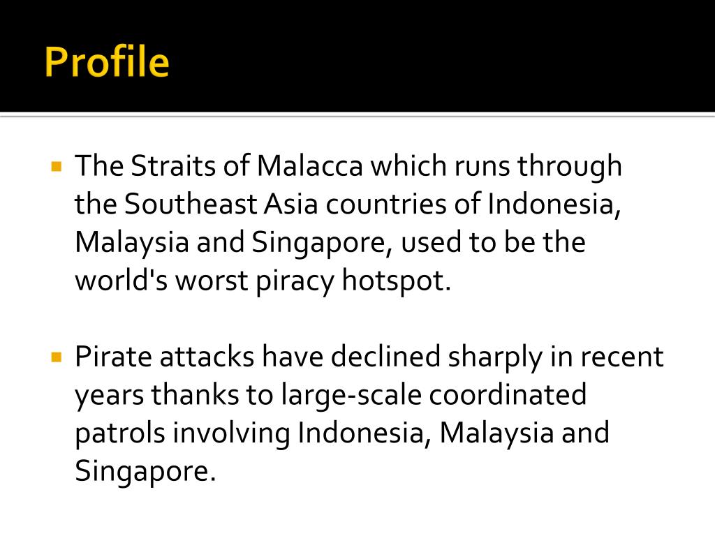 Profile • The Straits of Malacca which runs through the Southeast Asia countries of Indonesia, Malaysia and Singapore, used to be the world's worst piracy hotspot. • Pirate attacks have declined sharply in recent years thanks to large-scale coordinated patrols involving Indonesia, Malaysia and Singapore.