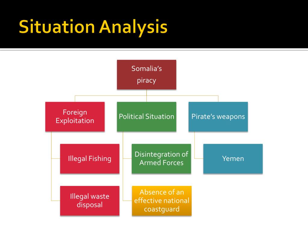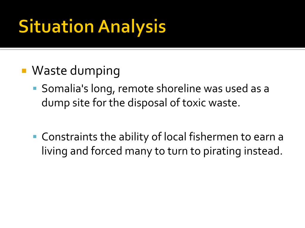 Situation Analysis • Waste dumping • Somalia's long, remote shoreline was used as a dump site for the disposal of toxic waste. • Constraints the ability of local fishermen to earn a living and forced many to turn to pirating instead.