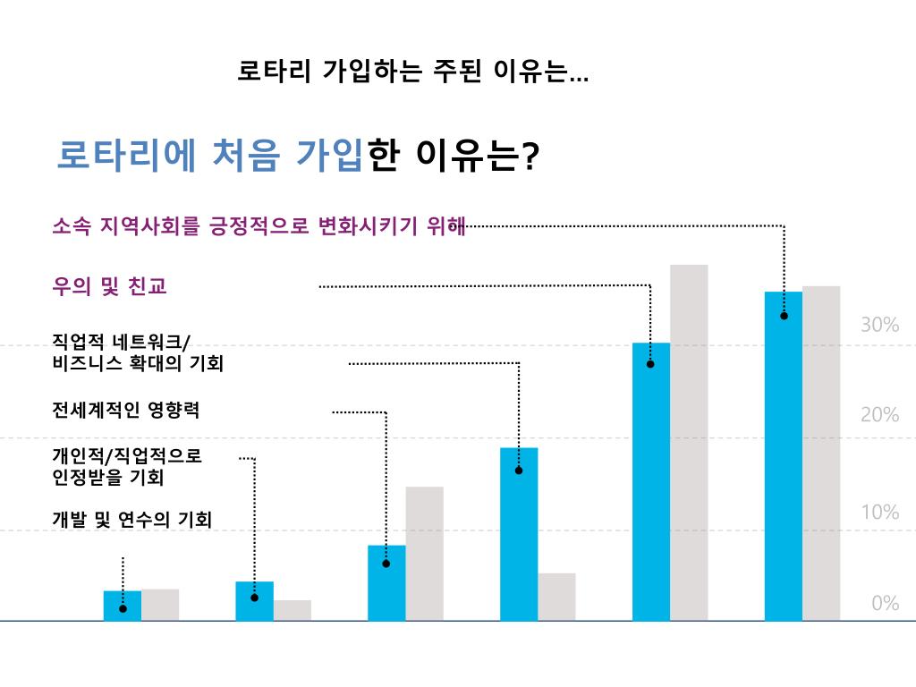 로타리 가입하는 주된 이유는… 로타리에 처음 가입한 이유는? 소속 지역사회를 긍정적으로 변화시키기 위해 우의 및 친교 30% 직업적 네트워크/비즈니스 확대의 기회 전세계적인 영향력 20% 개인적/직업적으로 인정받을 기회 10% 개발 및 연수의 기회 0%
