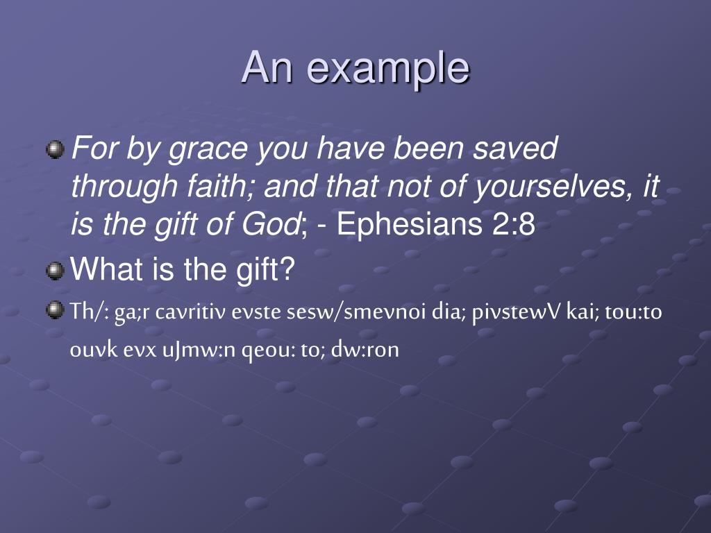 An example • For by grace you have been saved through faith; and that not of yourselves, it is the gift of God; - Ephesians 2:8 • What is the gift? • Th/: ga;r cavritiv evste sesw/smevnoi dia; pivstewV kai; tou:to ouvk evx uJmw:n qeou: to; dw:ron