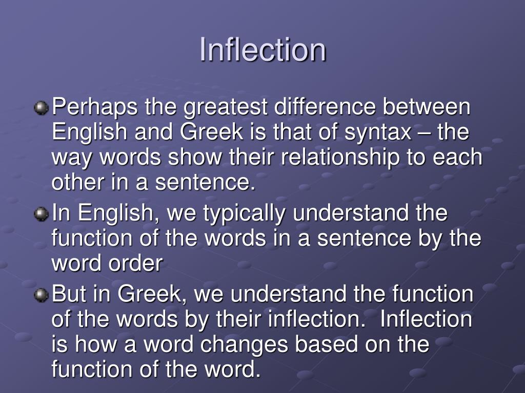 Inflection • Perhaps the greatest difference between English and Greek is that of syntax – the way words show their relationship to each other in a sentence. • In English, we typically understand the function of the words in a sentence by the word order • But in Greek, we understand the function of the words by their inflection. Inflection is how a word changes based on the function of the word.