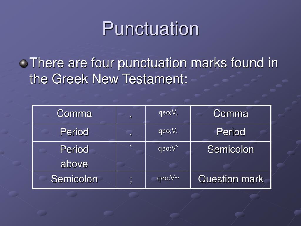 Punctuation • There are four punctuation marks found in the Greek New Testament: