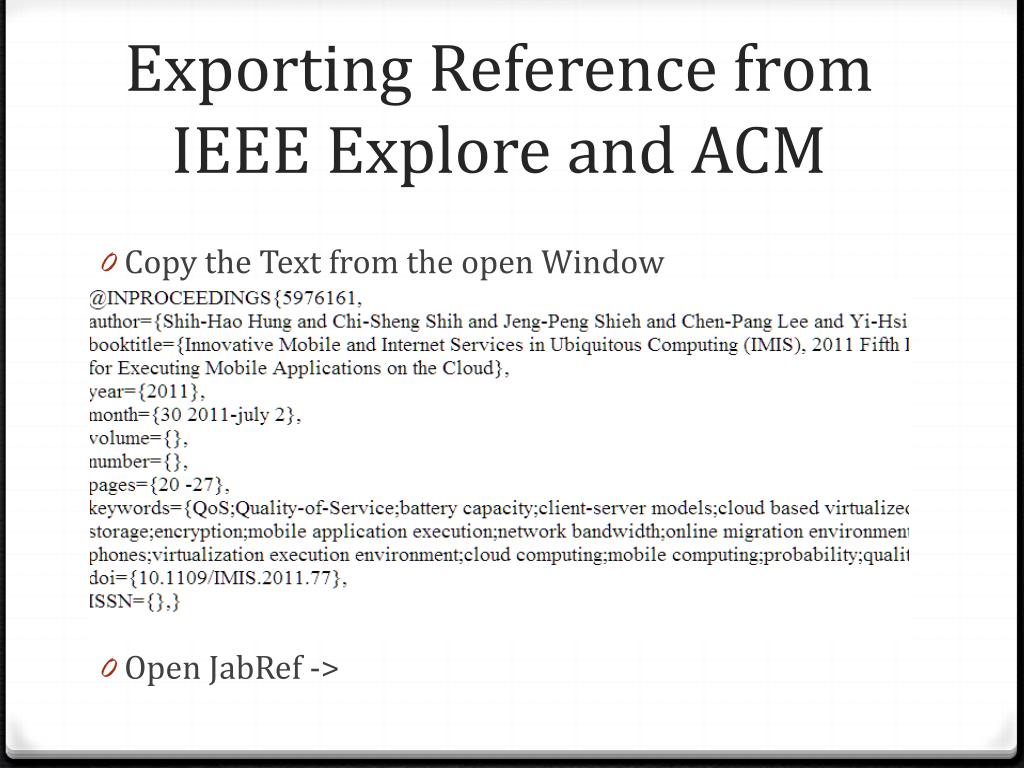 Exporting Reference from IEEE Explore and ACM • Copy the Text from the open Window • Open JabRef ->