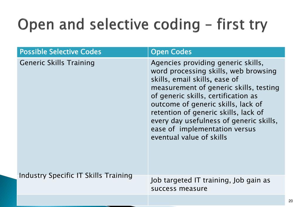 Analysis equals emerging dimensions of the research question • One of the most interesting aspects of the interview is the idea that impact of IT skills training is hard to measure, and that the most impact is made by locally relevant training. So one emerging research question might be: • How can we measure the impact of IT skills training? • Another might be; • How important is the context of IT skills training?