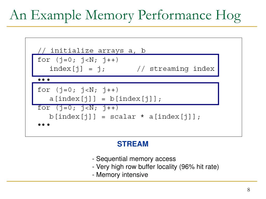 An Example Memory Performance Hog STREAM • Sequential memory access • Very high row buffer locality (96% hit rate) • Memory intensive