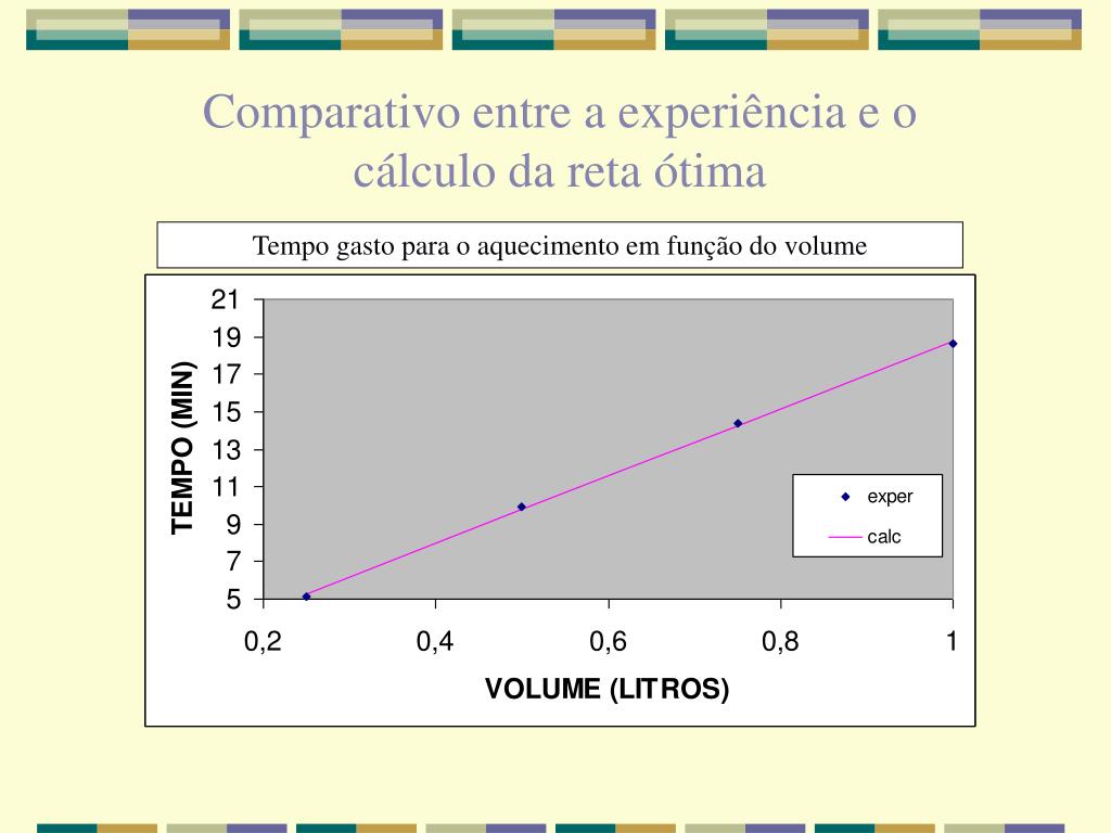 Comparativo entre a experiência e o cálculo da reta ótima Tempo gasto para o aquecimento em função do volume