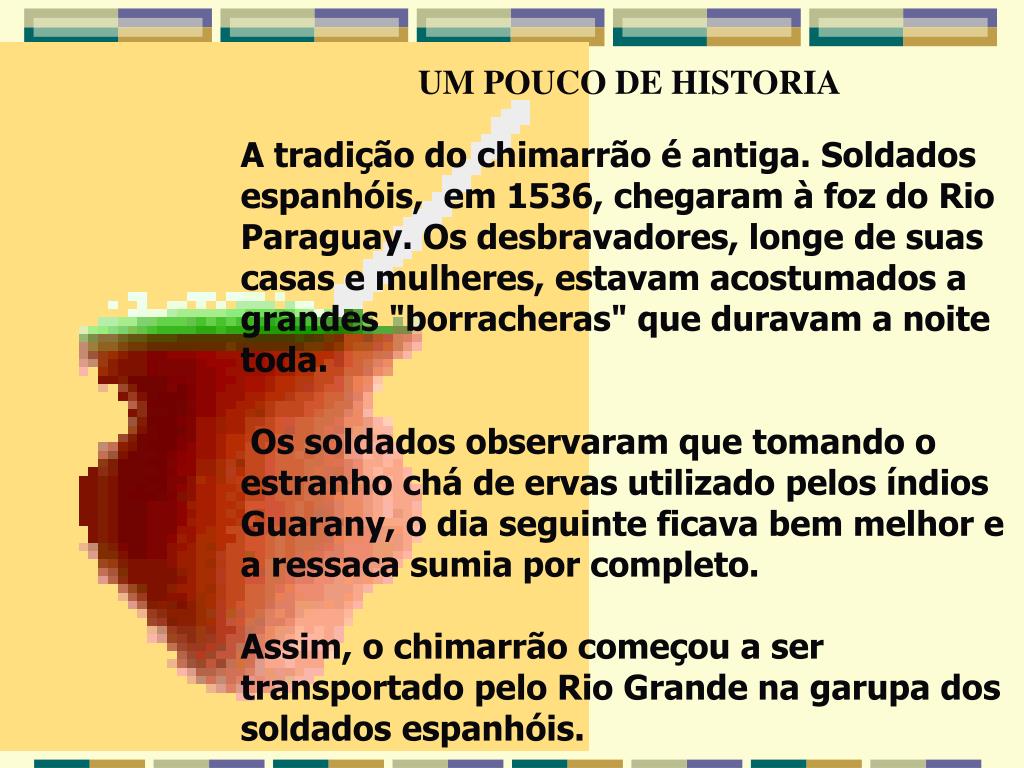 UM POUCO DE HISTORIA A tradição do chimarrão é antiga. Soldados espanhóis, em 1536, chegaram à foz do Rio Paraguay. Os desbravadores, longe de suas casas e mulheres, estavam acostumados a grandes "borracheras" que duravam a noite toda. Os soldados observaram que tomando o estranho chá de ervas utilizado pelos índios Guarany, o dia seguinte ficava bem melhor e a ressaca sumia por completo. Assim, o chimarrão começou a ser transportado pelo Rio Grande na garupa dos soldados espanhóis.