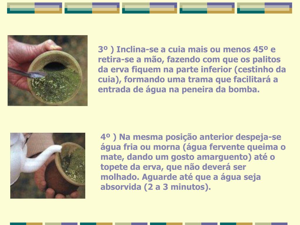 3º ) Inclina-se a cuia mais ou menos 45º e retira-se a mão, fazendo com que os palitos da erva fiquem na parte inferior (cestinho da cuia), formando uma trama que facilitará a entrada de água na peneira da bomba. 4º ) Na mesma posição anterior despeja-se água fria ou morna (água fervente queima o mate, dando um gosto amarguento) até o topete da erva, que não deverá ser molhado. Aguarde até que a água seja absorvida (2 a 3 minutos).