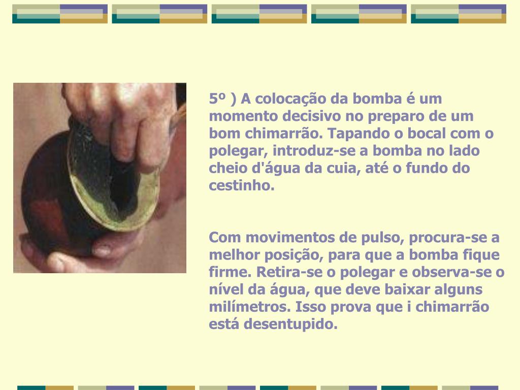 5º ) A colocação da bomba é um momento decisivo no preparo de um bom chimarrão. Tapando o bocal com o polegar, introduz-se a bomba no lado cheio d'água da cuia, até o fundo do cestinho. Com movimentos de pulso, procura-se a melhor posição, para que a bomba fique firme. Retira-se o polegar e observa-se o nível da água, que deve baixar alguns milímetros. Isso prova que i chimarrão está desentupido.