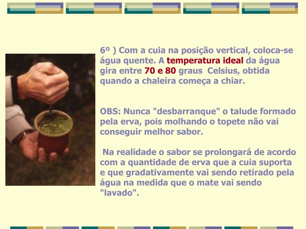 6º ) Com a cuia na posição vertical, coloca-se água quente. A temperatura ideal da água gira entre 70 e 80 graus Celsius, obtida quando a chaleira começa a chiar. OBS: Nunca "desbarranque" o talude formado pela erva, pois molhando o topete não vai conseguir melhor sabor. Na realidade o sabor se prolongará de acordo com a quantidade de erva que a cuia suporta e que gradativamente vai sendo retirado pela água na medida que o mate vai sendo "lavado".