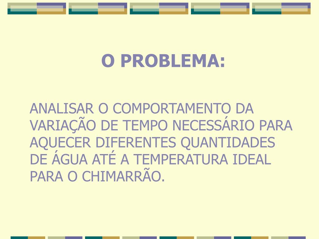 O PROBLEMA: ANALISAR O COMPORTAMENTO DA VARIAÇÃO DE TEMPO NECESSÁRIO PARA AQUECER DIFERENTES QUANTIDADES DE ÁGUA ATÉ A TEMPERATURA IDEAL PARA O CHIMARRÃO.