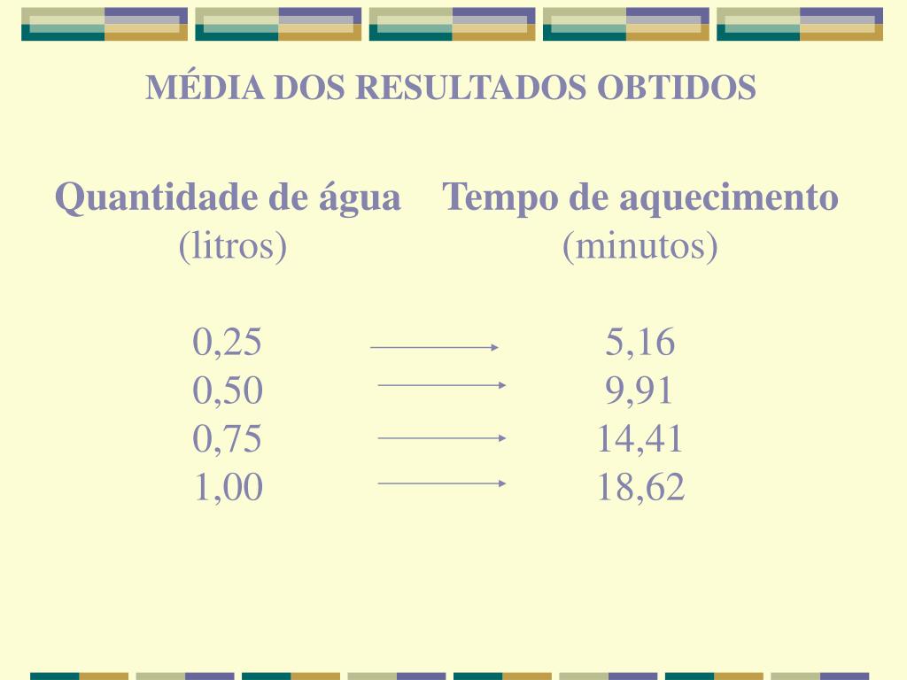 MÉDIA DOS RESULTADOS OBTIDOS Quantidade de água (litros) 0,25 0,50 0,75 1,00 Tempo de aquecimento (minutos) 5,16 9,91 14,41 18,62