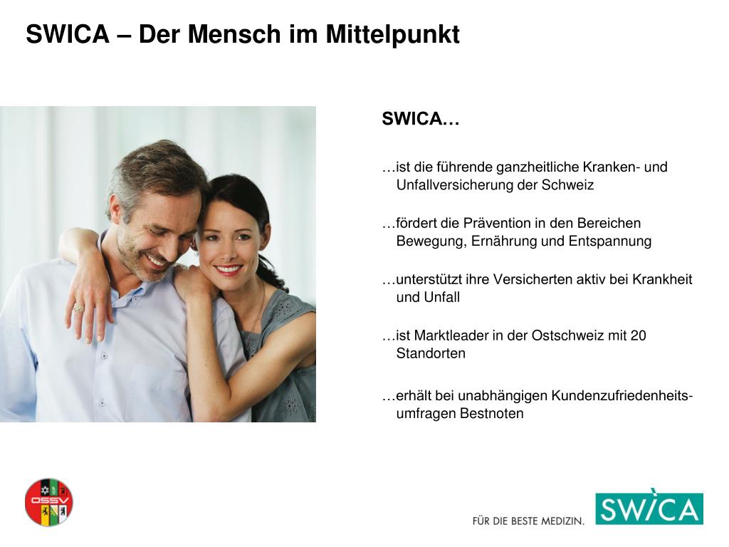 SWICA – Der Mensch im Mittelpunkt SWICA… …ist die führende ganzheitliche Kranken- und Unfallversicherung der Schweiz …fördert die Prävention in den Bereichen Bewegung, Ernährung und Entspannung …unterstützt ihre Versicherten aktiv bei Krankheit und Unfall …ist Marktleader in der Ostschweiz mit 20 Standorten …erhält bei unabhängigen Kundenzufriedenheits-umfragen Bestnoten