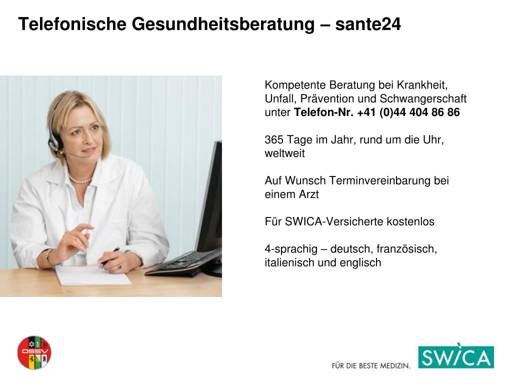 Telefonische Gesundheitsberatung – sante24 Kompetente Beratung bei Krankheit, Unfall, Prävention und Schwangerschaft unter Telefon-Nr. +41 (0)44 404 86 86 365 Tage im Jahr, rund um die Uhr, weltweit Auf Wunsch Terminvereinbarung bei einem Arzt Für SWICA-Versicherte kostenlos 4-sprachig – deutsch, französisch, italienisch und englisch