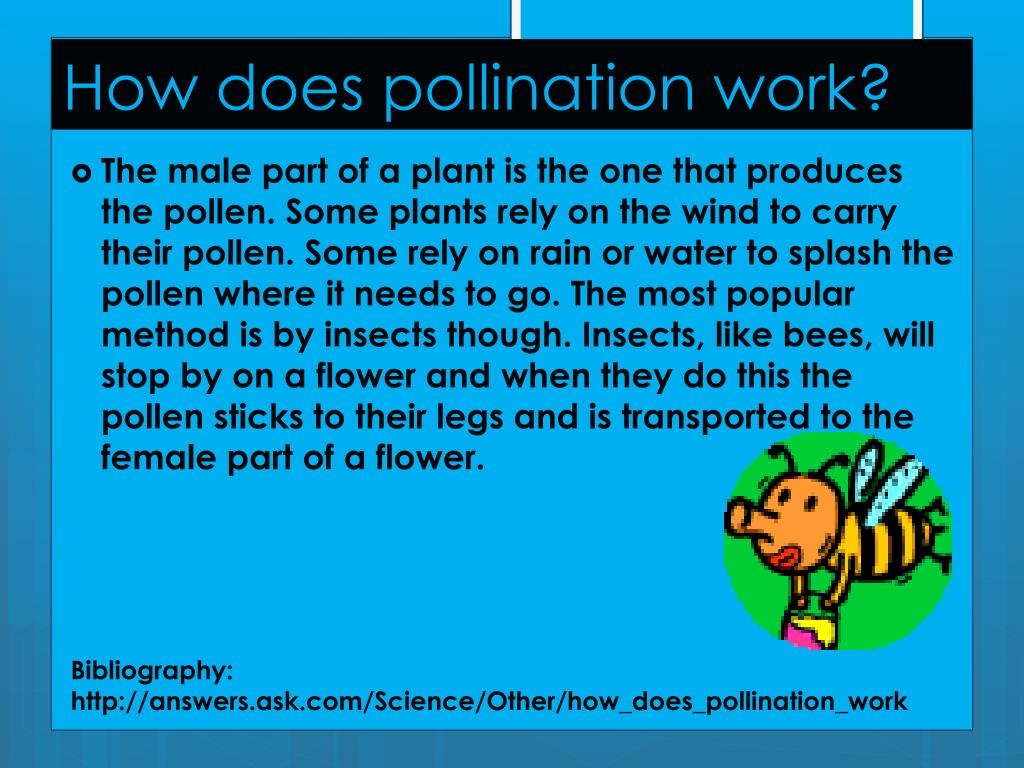 How does pollination work? • The male part of a plant is the one that produces the pollen. Some plants rely on the wind to carry their pollen. Some rely on rain or water to splash the pollen where it needs to go. The most popular method is by insects though. Insects, like bees, will stop by on a flower and when they do this the pollen sticks to their legs and is transported to the female part of a flower. Bibliography: http://answers.ask.com/Science/Other/how_does_pollination_work