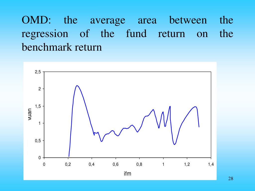 The OMD Introducing the utility function in the equivalent margin formula gives: OMD = the average area between the regression curve of the fund return on the benchmark return and the benchmark return itself, taken on the Ox axis If t(P)>0 for all P, then the fund was superior to the benchmark