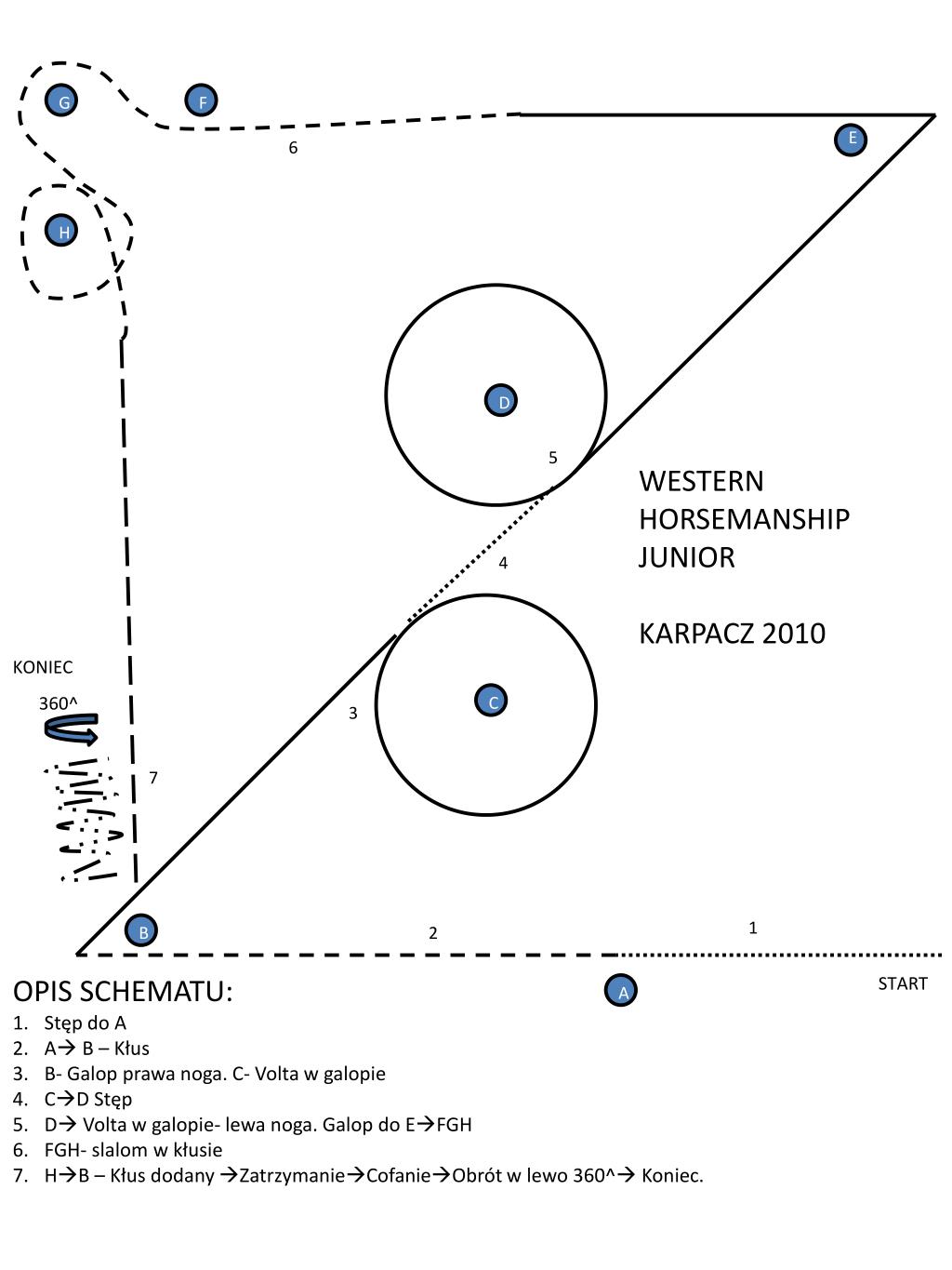 G F E 6 H D 5 WESTERN HORSEMANSHIP JUNIOR KARPACZ 2010 4 KONIEC 360^ C 3 7 1 B 2 OPIS SCHEMATU: Stęp do A A B – Kłus B- Galop prawa noga. C- Volta w galopie CD Stęp D Volta w galopie- lewa noga. Galop do EFGH FGH- slalom w kłusie HB – Kłus dodany ZatrzymanieCofanieObrót w lewo 360^ Koniec. START A