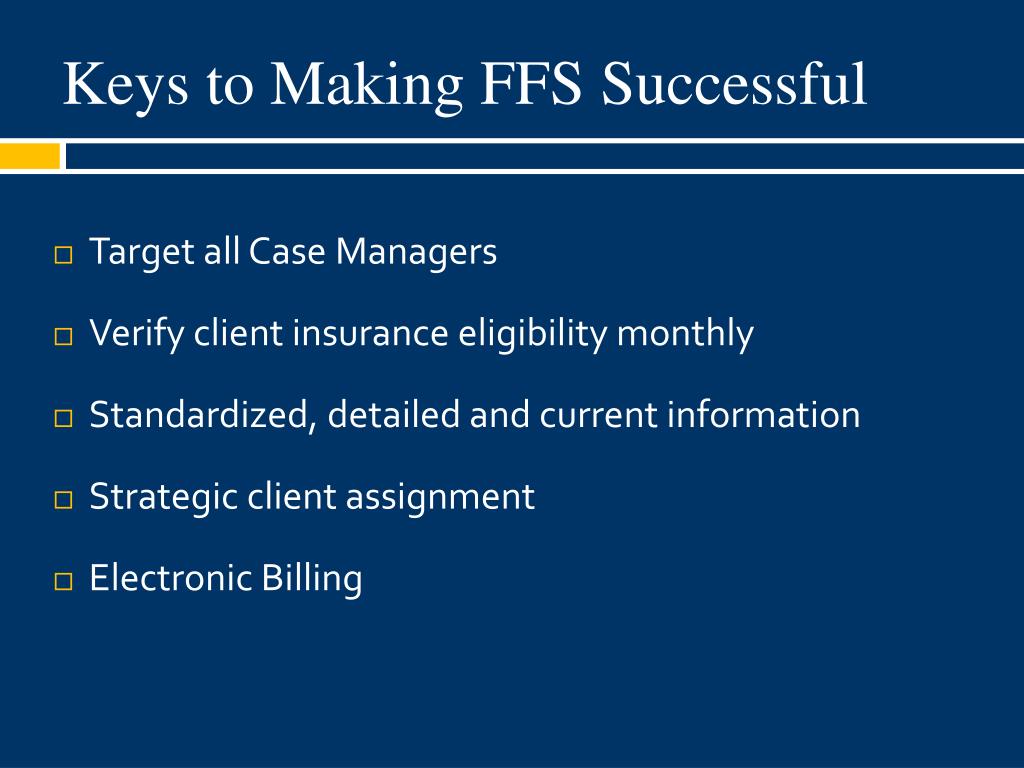 Keys to Making FFS Successful • Target all Case Managers • Verify client insurance eligibility monthly • Standardized, detailed and current information • Strategic client assignment • Electronic Billing