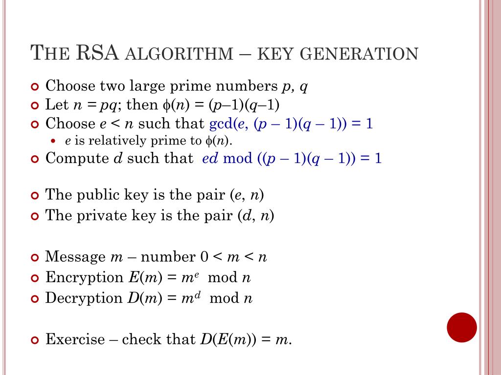 The RSA algorithm – key generation • Choose two large prime numbers p, q • Let n = pq; then (n) = (p–1)(q–1) • Choose e < nsuch that gcd(e,(p–1)(q–1)) = 1 • eis relatively prime to (n). • Compute d such that ed mod ((p–1)(q–1))= 1 • The public key is the pair (e, n) • The private key is the pair (d, n) • Message m – number 0 < m < n • Encryption E(m) = me mod n • Decryption D(m) = md mod n • Exercise – check that D(E(m)) = m.