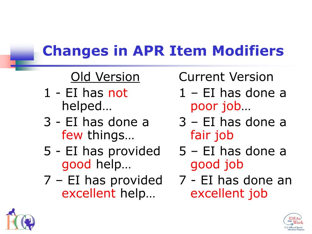 Old Version 1 - EI has not helped… 3 - EI has done a few things… 5 - EI has provided good help… 7 – EI has provided excellent help… Current Version 1 – EI has done a poor job… 3 – EI has done a fair job 5 – EI has done a good job 7 - EI has done an excellent job Changes in APR Item Modifiers