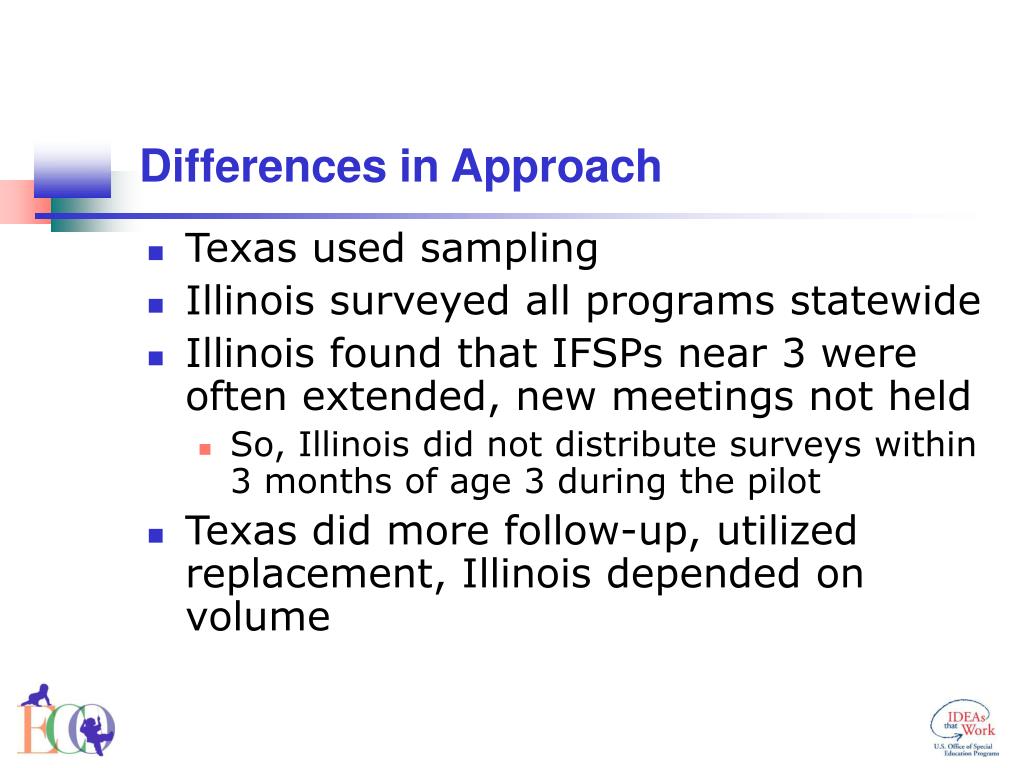 Differences in Approach • Texas used sampling • Illinois surveyed all programs statewide • Illinois found that IFSPs near 3 were often extended, new meetings not held • So, Illinois did not distribute surveys within 3 months of age 3 during the pilot • Texas did more follow-up, utilized replacement, Illinois depended on volume