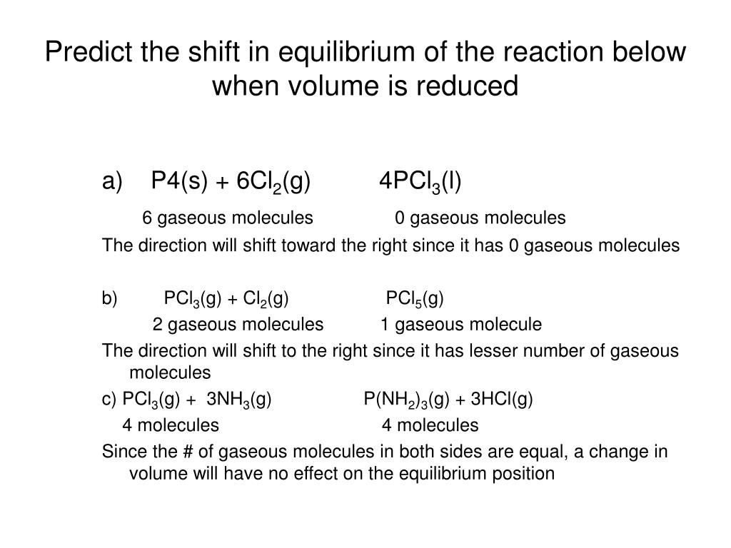 Predict the shift in equilibrium of the reaction below when volume is reduced a) P4(s) + 6Cl2(g) 4PCl3(l) 6 gaseous molecules 0 gaseous molecules The direction will shift toward the right since it has 0 gaseous molecules b) PCl3(g) + Cl2(g) PCl5(g) 2 gaseous molecules 1 gaseous molecule The direction will shift to the right since it has lesser number of gaseous molecules c) PCl3(g) + 3NH3(g) P(NH2)3(g) + 3HCl(g) 4 molecules 4 molecules Since the # of gaseous molecules in both sides are equal, a change in volume will have no effect on the equilibrium position