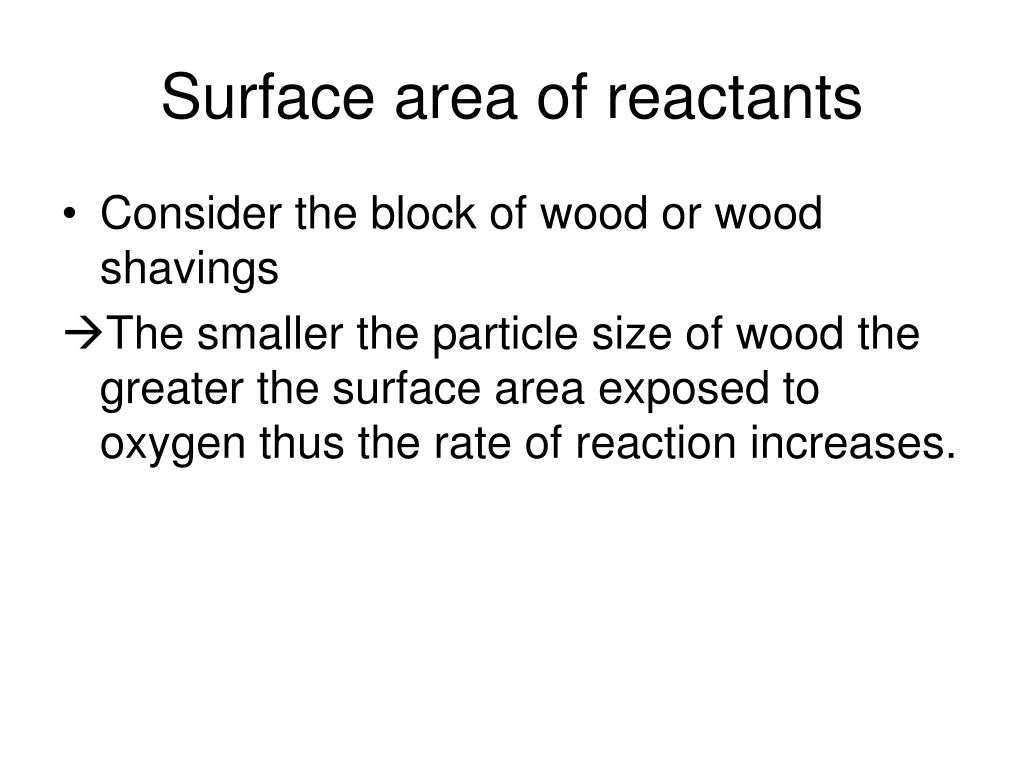 Surface area of reactants • Consider the block of wood or wood shavings • The smaller the particle size of wood the greater the surface area exposed to oxygen thus the rate of reaction increases.