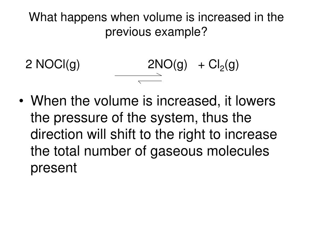 What happens when volume is increased in the previous example? 2 NOCl(g) 2NO(g) + Cl2(g) • When the volume is increased, it lowers the pressure of the system, thus the direction will shift to the right to increase the total number of gaseous molecules present
