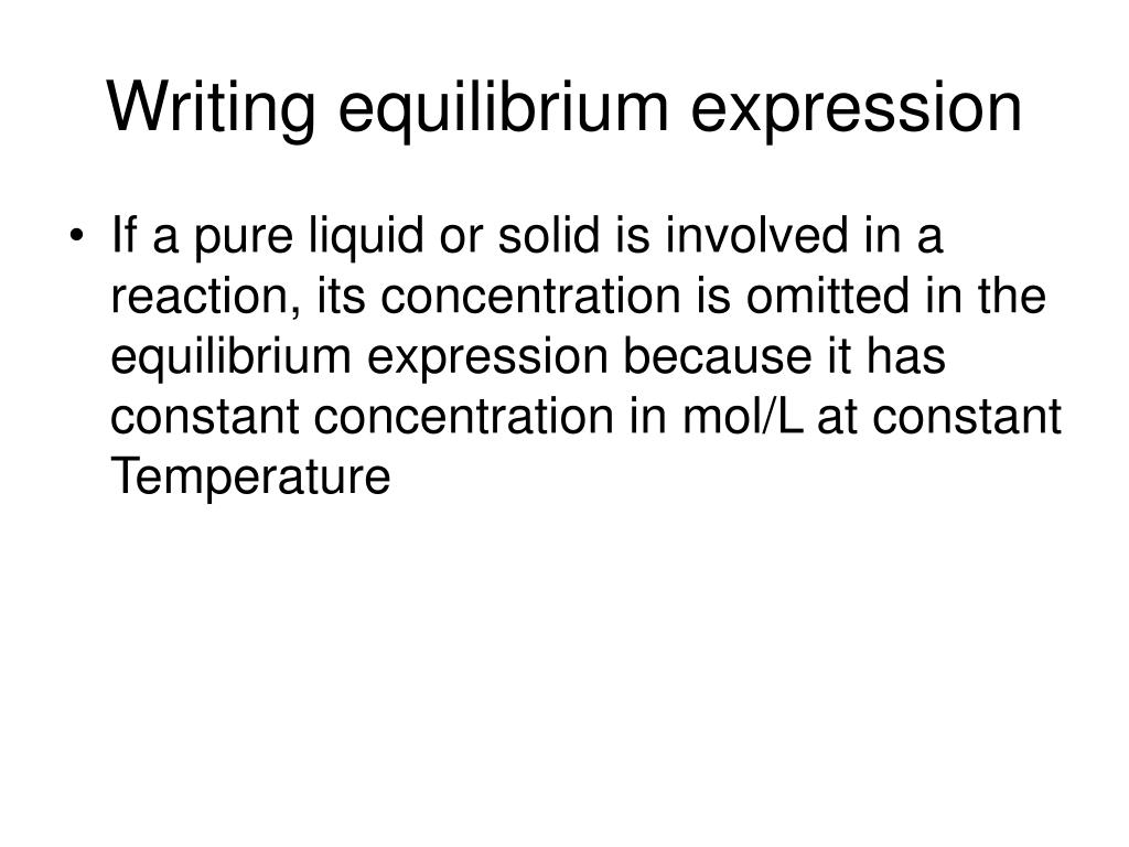 Writing equilibrium expression • If a pure liquid or solid is involved in a reaction, its concentration is omitted in the equilibrium expression because it has constant concentration in mol/L at constant Temperature