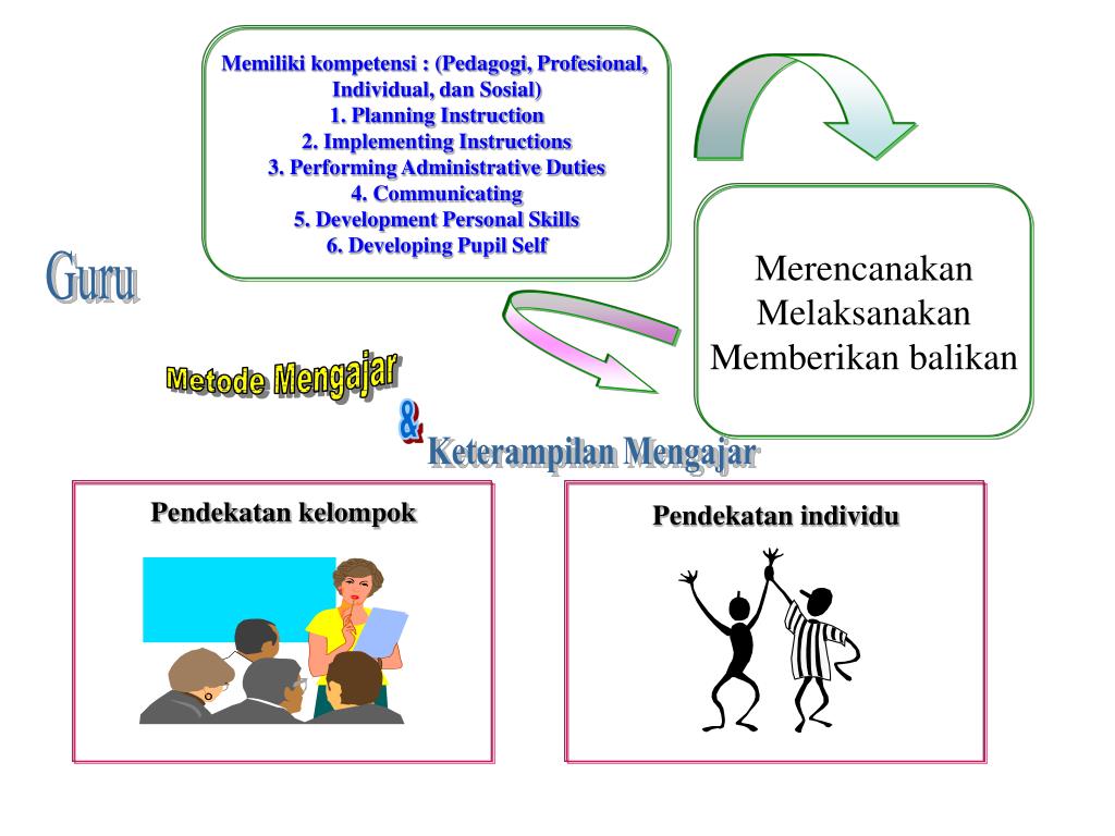 Memiliki kompetensi : (Pedagogi, Profesional, Individual, dan Sosial) 1. Planning Instruction 2. Implementing Instructions 3. Performing Administrative Duties 4. Communicating 5. Development Personal Skills 6. Developing Pupil Self Merencanakan Melaksanakan Memberikan balikan Guru Metode Mengajar & Keterampilan Mengajar Pendekatan kelompok Pendekatan individu