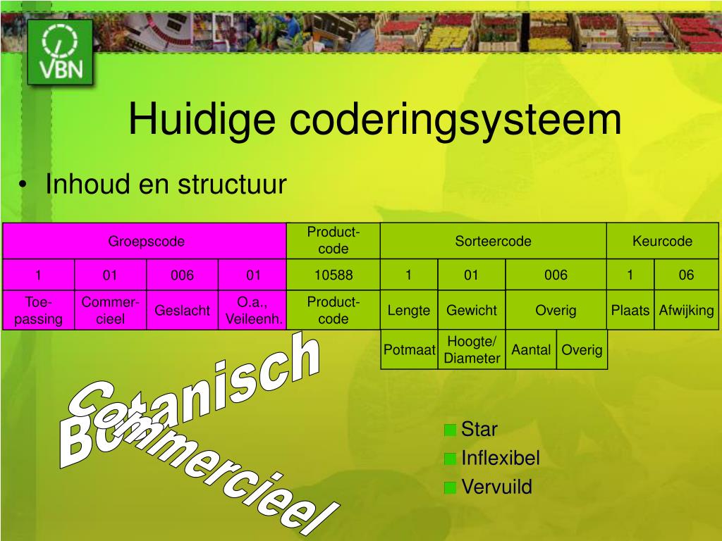 Sorteercode Keurcode Groepscode Product- code 1 01 006 01 10588 1 01 006 1 06 Lengte Overig Plaats Afwijking Toe- passing Commer- cieel Geslacht O.a., Veileenh. Product- code Gewicht Potmaat Hoogte/ Diameter Aantal Overig Huidige coderingsysteem • Inhoud en structuur Botanisch Commercieel • Star • Inflexibel • Vervuild