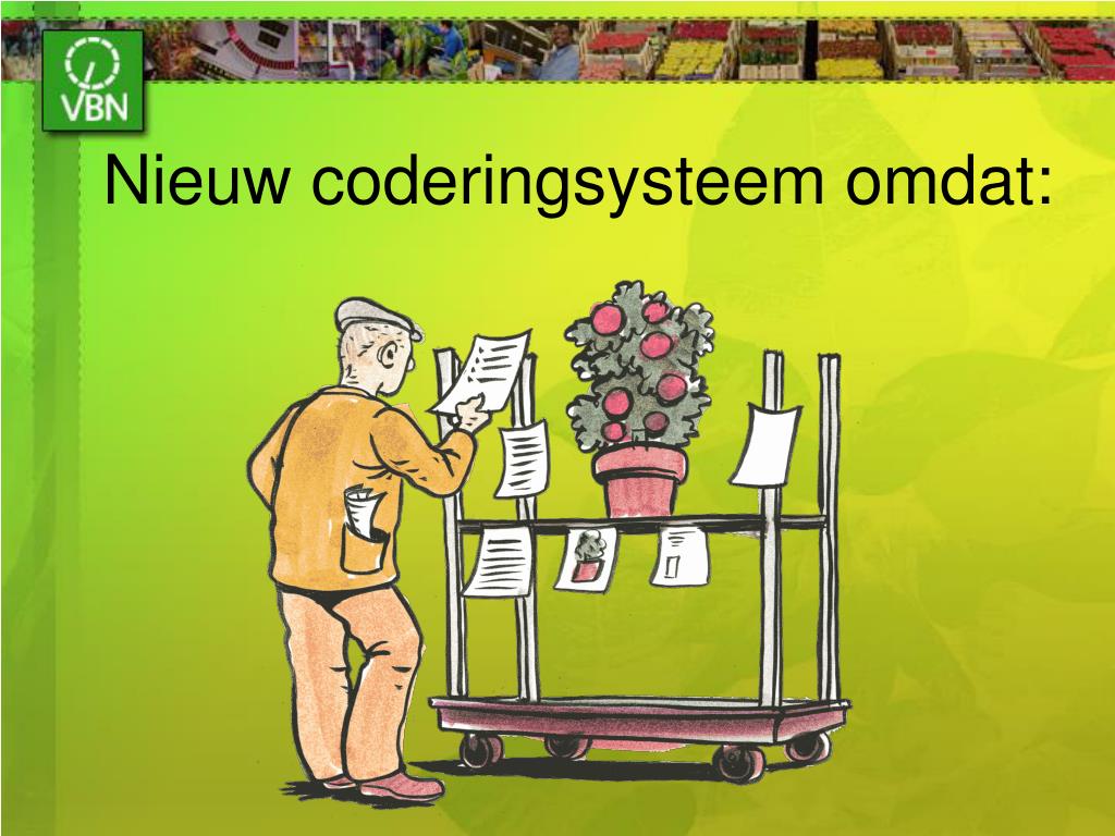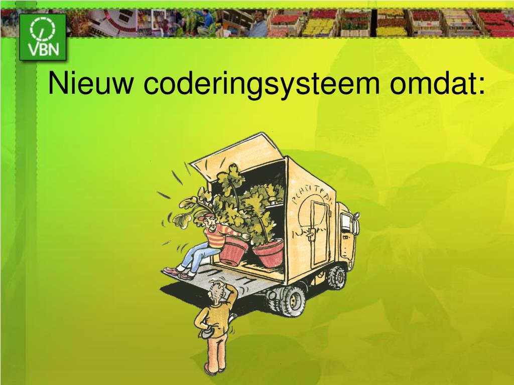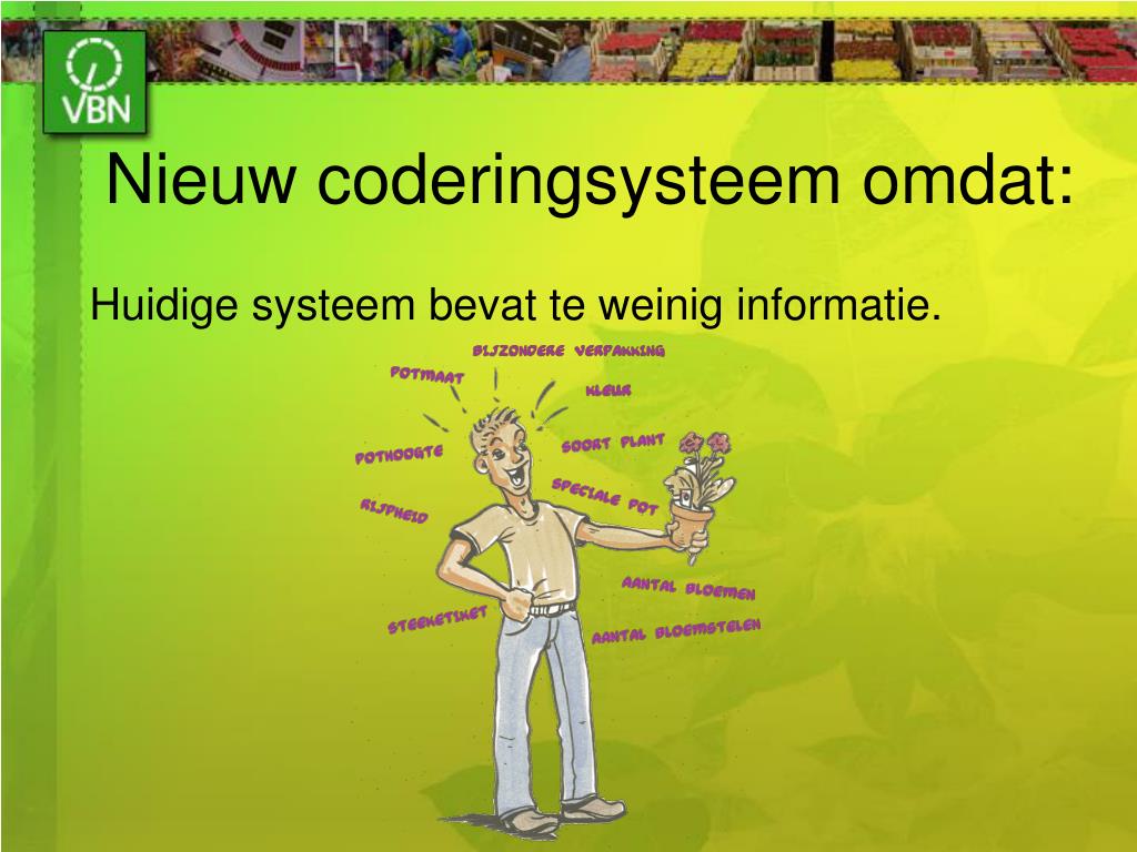Nieuw coderingsysteem omdat: Huidige systeem bevat te weinig informatie.