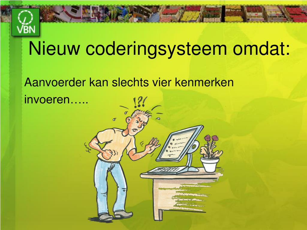Nieuw coderingsysteem omdat: Aanvoerder kan slechts vier kenmerken invoeren…..