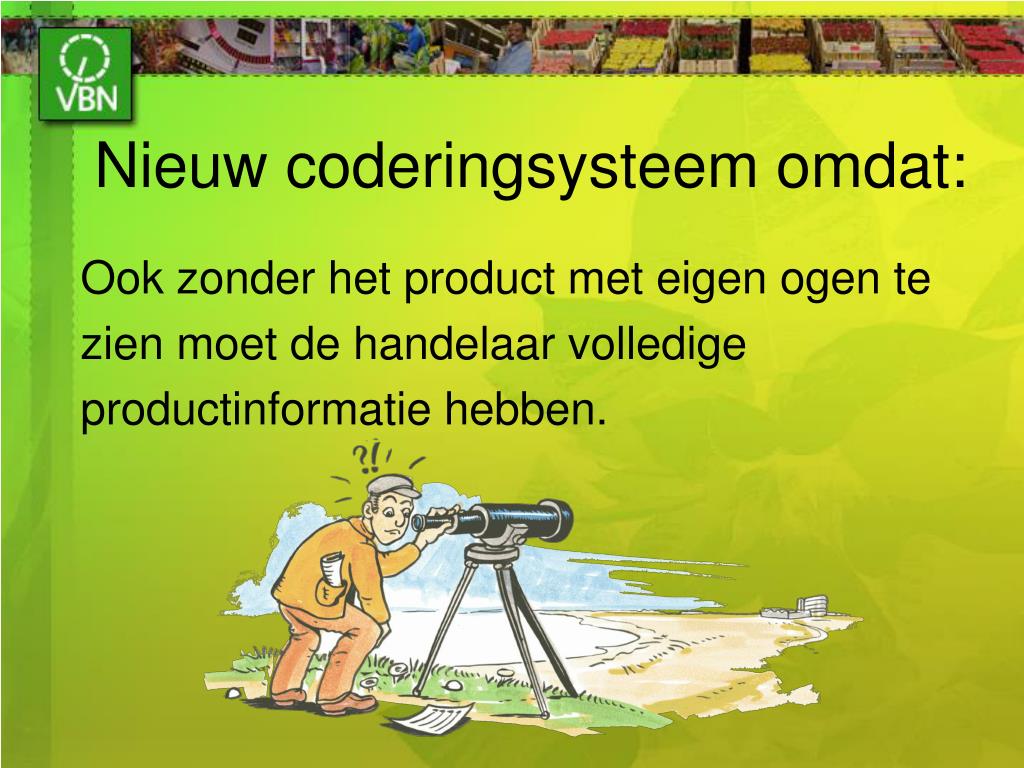 Nieuw coderingsysteem omdat: Ook zonder het product met eigen ogen te zien moet de handelaar volledige productinformatie hebben.