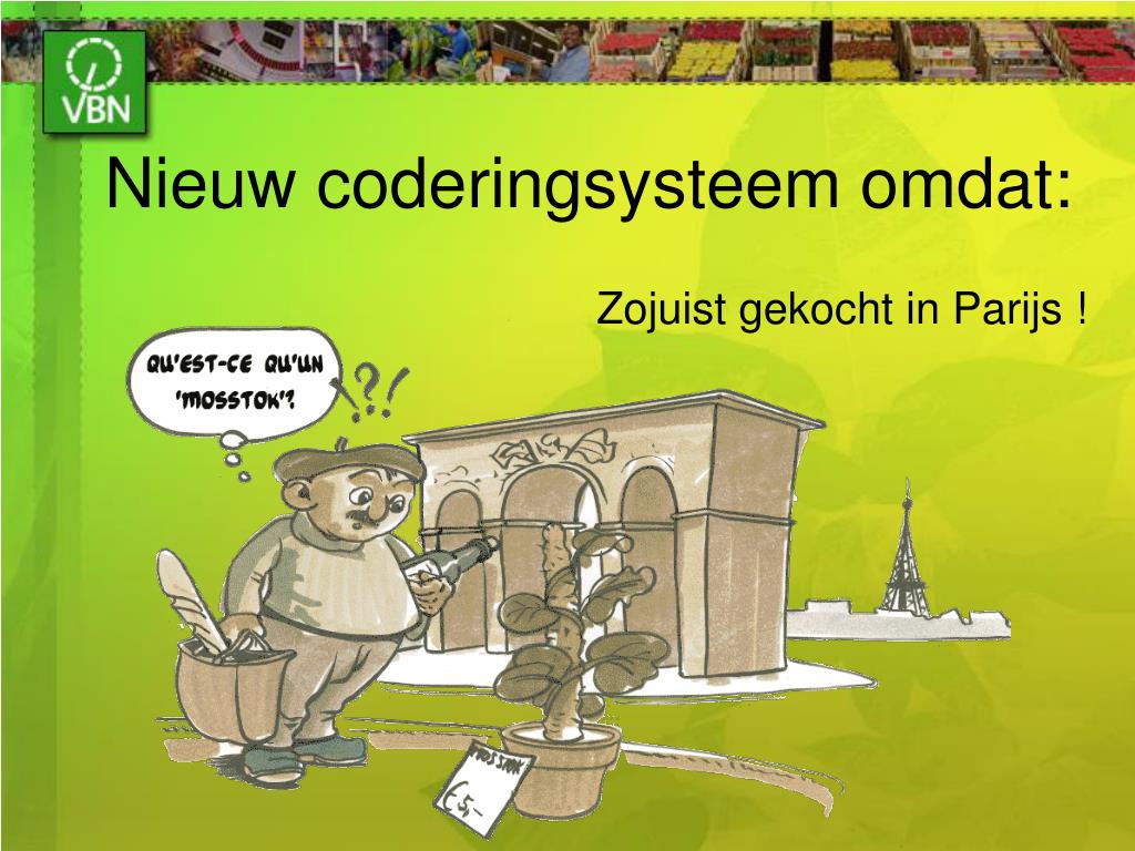 Hoe nu verder? • Begin 2004 ligt er een plan hoe het nieuwe coderingsysteem ingevoerd wordt; • De implementatie zal stap voor stap worden uitgevoerd; • Softwareleveranciers van handel en aanvoerders worden hierbij betrokken; • Mogelijke veranderingen voor úw werkzaamheden of in de gegevens die u verwerkt, verneemt u in een zo vroeg mogelijk stadium.