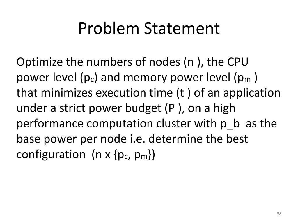 Problem Statement Optimize the numbers of nodes (n ), the CPU power level (pc) and memory power level (pm ) that minimizes execution time (t ) of an application under a strict power budget (P ), on a high performance computation cluster with p_b as the base power per node i.e. determine the best configuration (n x {pc, pm}) 38