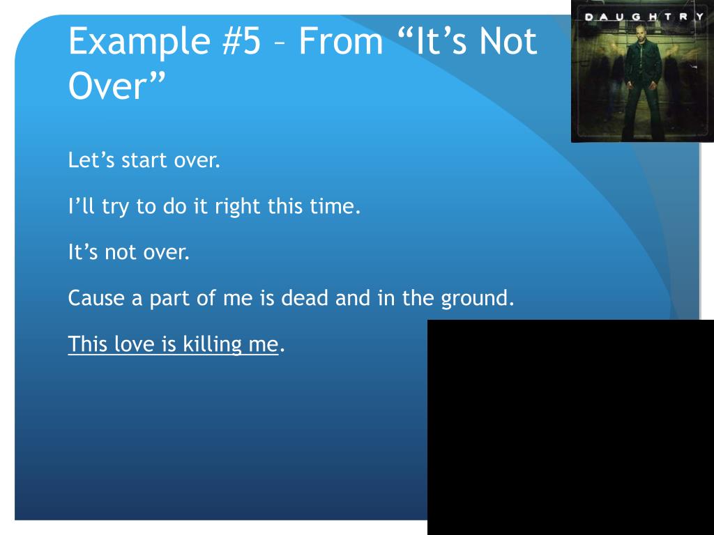 Example #5 – From “It’s Not Over” Let’s start over. I’ll try to do it right this time. It’s not over. Cause a part of me is dead and in the ground. This love is killing me.