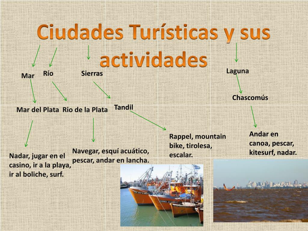 Ciudades Turísticas y sus actividades Laguna Río Sierras Mar Chascomús Tandil Mar del Plata Rio de la Plata Andar en canoa, pescar, kitesurf, nadar. Rappel, mountainbike, tirolesa, escalar. Navegar, esquí acuático, pescar, andar en lancha. Nadar, jugar en el casino, ir a la playa, ir al boliche, surf.