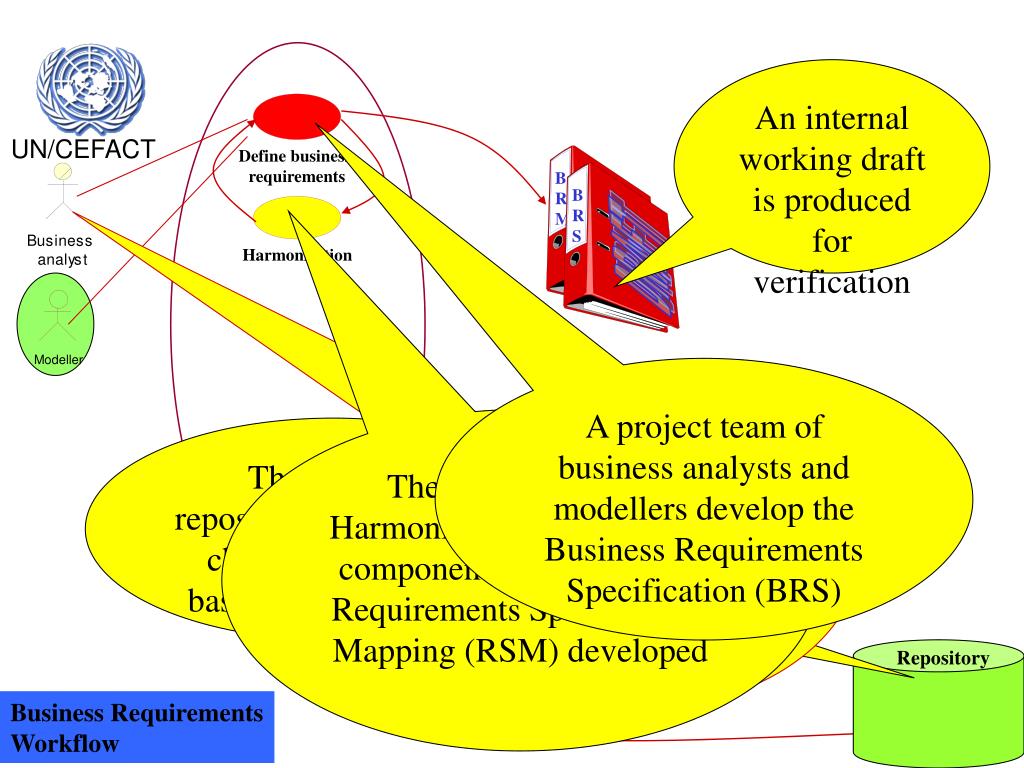 Modeller Define business requirements Harmonisation B R M B R S DRAFT DRAFT TBG Repository An internal working draft is produced for verification A project team of business analysts and modellers develop the Business Requirements Specification (BRS) The business analyst identifies a business requirement and proposes a project to the appropiate TBG working group The specification is Harmonised, candidate core components are identified, Requirements Specification Mapping (RSM) developed The existing repositories are used to check existance of basic building blocks Business Requirements Workflow