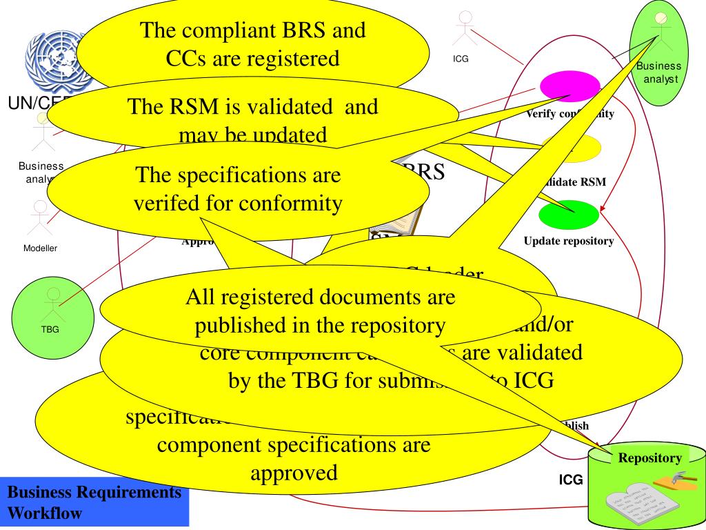 The compliant BRS and CCs are registered ICG Modeller Define business requirements Verify conformity BRS Harmonisation Update repository issues Approval RSM Validate RSM TBG Repository Publish TBG Repository ICG Creation The RSM is validated and may be updated The specifications are verifed for conformity A TBG leader follows the BRS through the ICG process All registered documents are published in the repository The Requirements specification and/or core component candidates are validated by the TBG for submission to ICG Formal Business requirements specifications and/or candidate core component specifications are approved Business Requirements Workflow