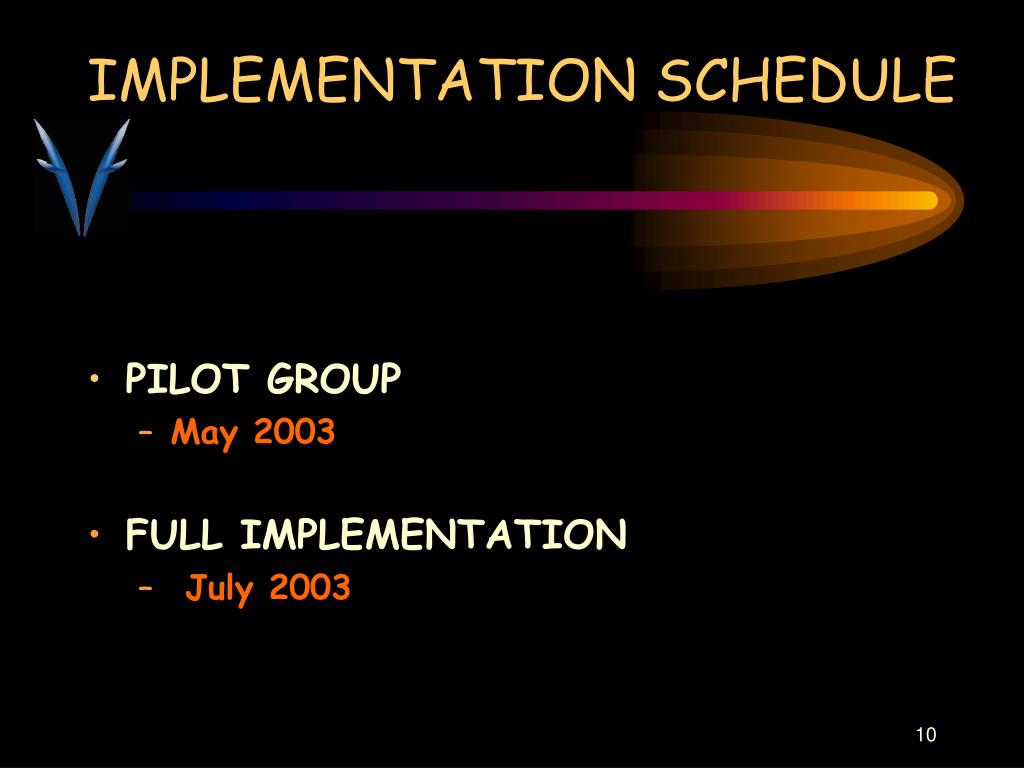 IMPLEMENTATION SCHEDULE • PILOT GROUP • May 2003 • FULL IMPLEMENTATION • July 2003