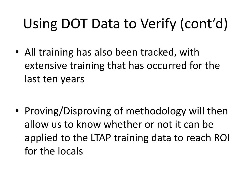 Using DOT Data to Verify (cont’d) • All training has also been tracked, with extensive training that has occurred for the last ten years • Proving/Disproving of methodology will then allow us to know whether or not it can be applied to the LTAP training data to reach ROI for the locals