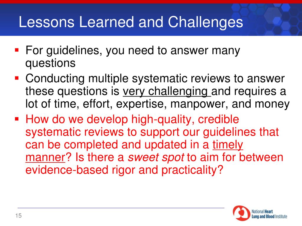 Lessons Learned and Challenges • For guidelines, you need to answer many questions • Conducting multiple systematic reviews to answer these questions is very challenging and requires a lot of time, effort, expertise, manpower, and money • How do we develop high-quality, credible systematic reviews to support our guidelines that can be completed and updated in a timely manner? Is there a sweet spot to aim for between evidence-based rigor and practicality?