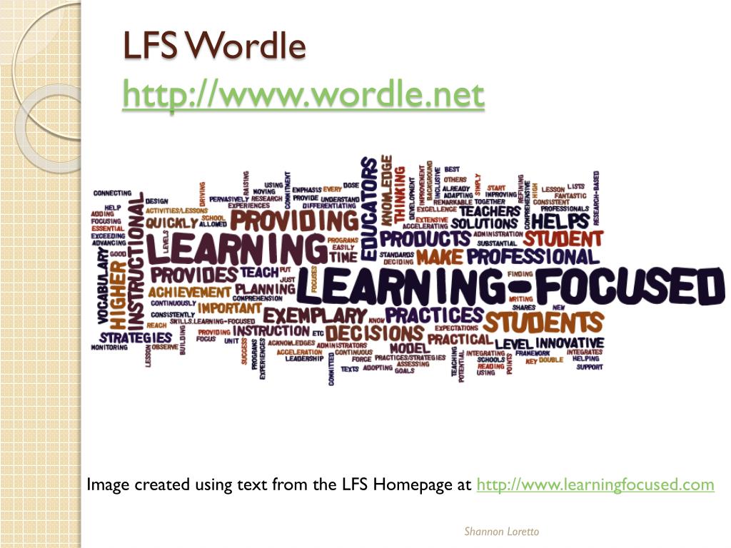 LFS Wordlehttp://www.wordle.net Image created using text from the LFS Homepage at http://www.learningfocused.com Shannon Loretto