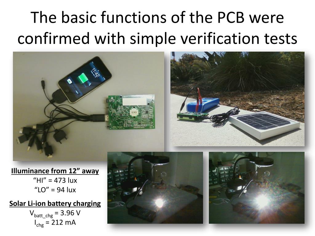 The basic functions of the PCB were confirmed with simple verification tests Illuminance from 12” away “HI” = 473 lux “LO” = 94 lux Solar Li-ion battery charging Vbatt_chg = 3.96 V Ichg = 212 mA