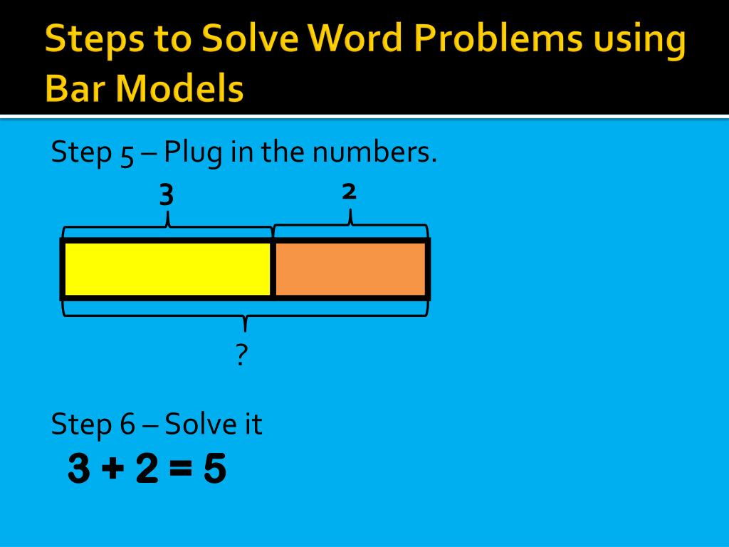 Steps to Solve Word Problems using Bar Models Step 5 – Plug in the numbers. Step 6 – Solve it 3 + 2 = 5 3 2 ?