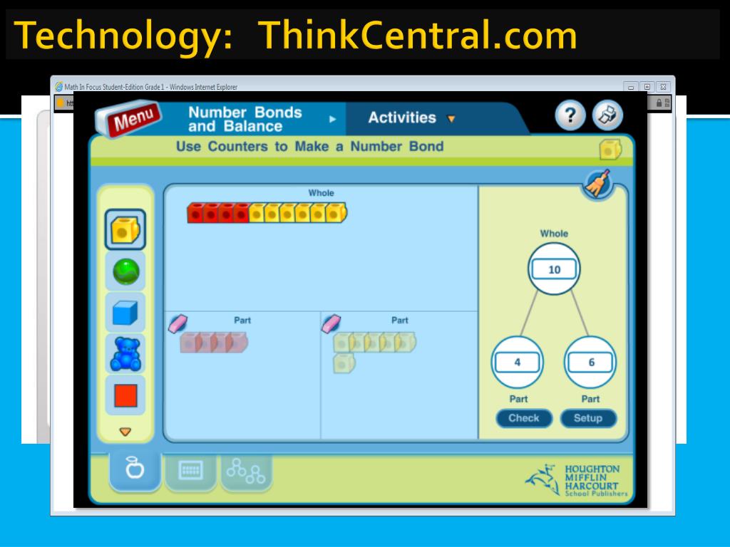Think Central • www.thinkcentral.com • Teachers can post assignments and test scores • Students can access • Student book • Student workbook • Virtual manipulatives • Student interactivities • Lesson videos