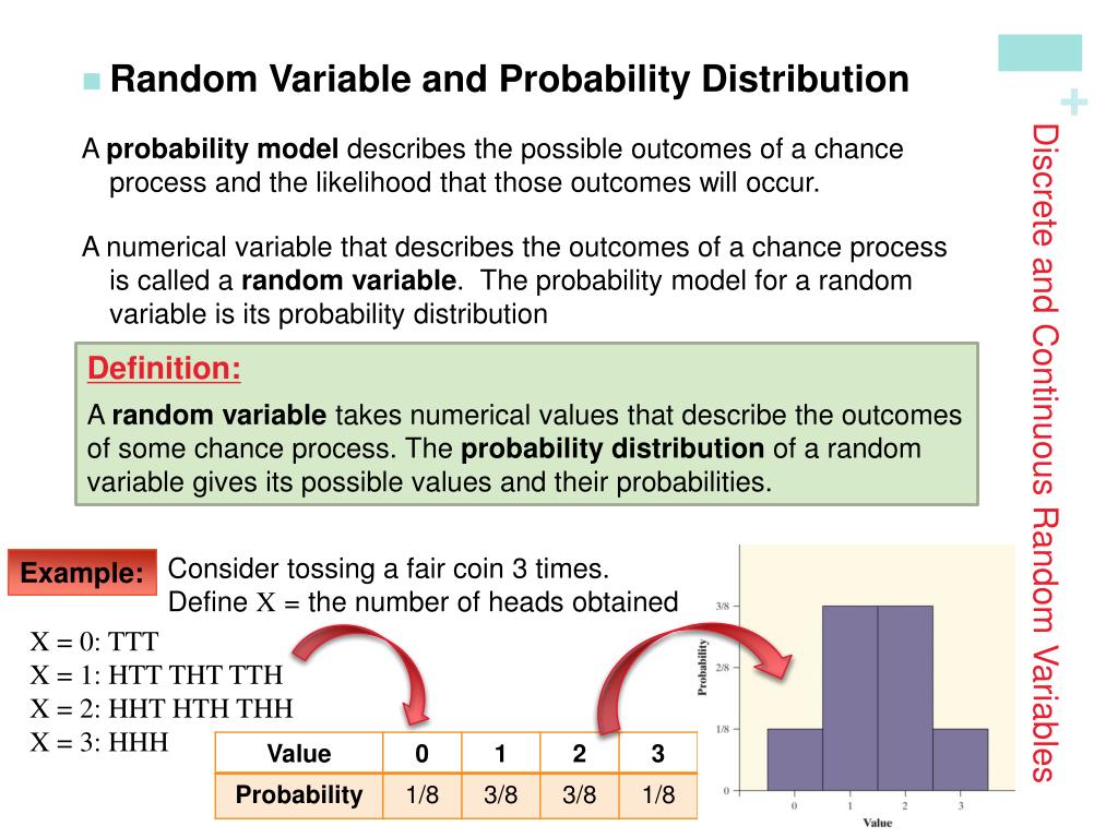 Discrete and Continuous Random Variables • Random Variable and Probability Distribution A probability model describes the possible outcomes of a chance process and the likelihood that those outcomes will occur. A numerical variable that describes the outcomes of a chance process is called a random variable. The probability model for a random variable is its probability distribution Definition: A random variable takes numerical values that describe the outcomes of some chance process. The probability distribution of a random variable gives its possible values and their probabilities. Consider tossing a fair coin 3 times. Define X = the number of heads obtained Example: X = 0: TTT X = 1: HTT THT TTH X = 2: HHT HTH THH X = 3: HHH
