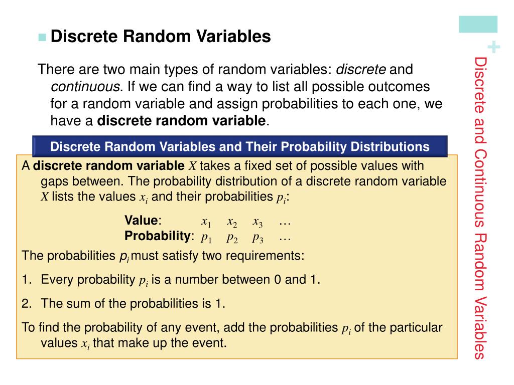 Discrete and Continuous Random Variables • Discrete Random Variables There are two main types of random variables: discrete and continuous. If we can find a way to list all possible outcomes for a random variable and assign probabilities to each one, we have a discrete random variable. Discrete Random Variables and Their Probability Distributions • A discrete random variableX takes a fixed set of possible values with gaps between. The probability distribution of a discrete random variable X lists the values xiand their probabilities pi: • Value: x1x2x3 … • Probability: p1p2p3 … • The probabilities pi must satisfy two requirements: • Every probability piis a number between 0 and 1. • The sum of the probabilities is 1. • To find the probability of any event, add the probabilities piof the particular values xithat make up the event.