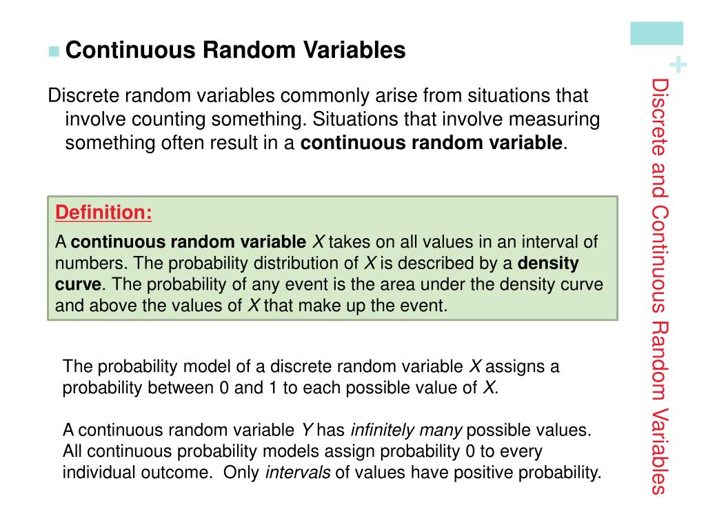 Discrete and Continuous Random Variables • Continuous Random Variables Discrete random variables commonly arise from situations that involve counting something. Situations that involve measuring something often result in a continuous random variable. Definition: A continuous random variableX takes on all values in an interval of numbers. The probability distribution of X is described by a density curve. The probability of any event is the area under the density curve and above the values of X that make up the event. The probability model of a discrete random variable X assigns a probability between 0 and 1 to each possible value of X. A continuous random variable Y has infinitely many possible values. All continuous probability models assign probability 0 to every individual outcome. Only intervals of values have positive probability.